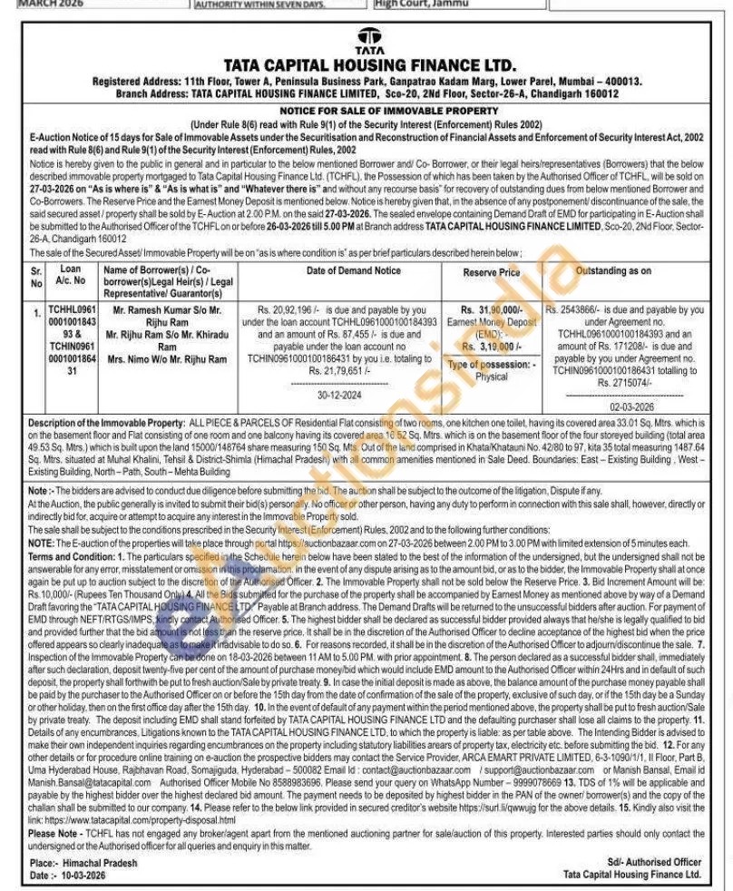 Description of the Immovable Property: ALL PIECE & PARCELS OF Residential Flat consisting of two rooms, one kitchen one toilet, having its covered area 33.01 Sq. Mtrs. which is on the basement floor and Flat consisting of one room and one balcony having its covered area 16.52 Sq. Mtrs. which is on the basement floor of the four storeyed building (total area 49.53 Sq. Mtrs.) which is built upon the land 15000/148764 share measuring 150 Sq. Mts. Out of the land comprised in Khata/Khatauni No. 42/80 to 97, kita 35 total measuring 1487.64 Sq. Mirs. situated at Muhal Khalini, Tehsil & District-Shimla (Himachal Pradesh) with all common amenities mentioned in Sale Deed. Boundaries: East-Existing Building, West-Existing Building, North-Path, South-Mehta Building