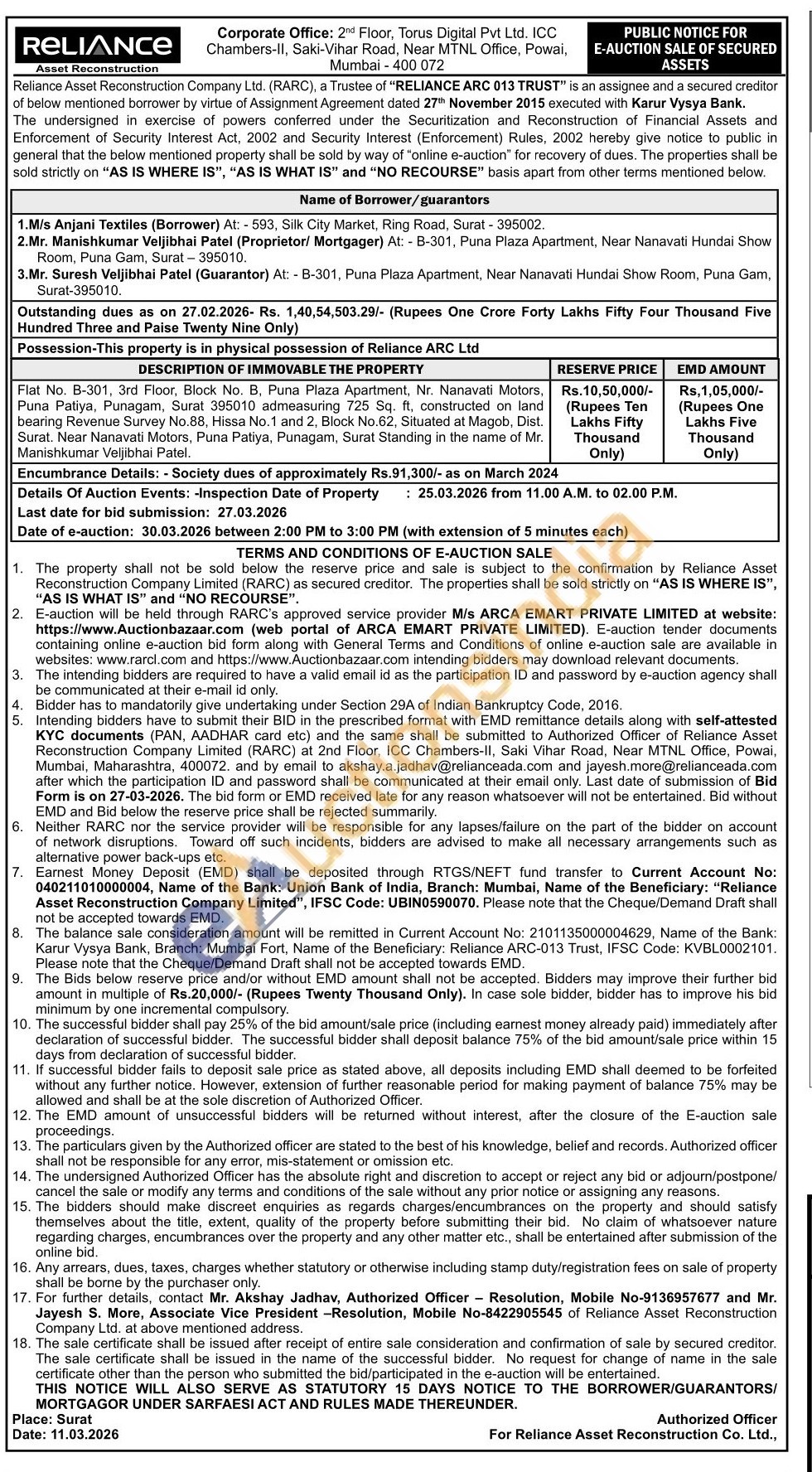 Flat No. B-301, 3rd Floor, Block No. B. Puna Plaza Apartment. Nr. Nanavati Motors, Puna Patiya, Punagam, Surat 395010 admeasuring 725 Sq. ft, constructed on land bearing Revenue Survey No.88, Hissa No. 1 and 2, Block No.62, Situated at Magob, Dist Surat. Near Nanavati Motors, Puna Patiya, Punagam, Surat Standing in the name of Mr. Manishkumar Veljibhai Patel,