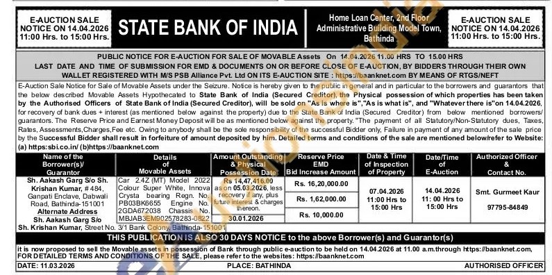 Car 2.4Z (MT) Model 2022 Colour Super White, Innova Crysta bearing Regn. No. PB03BK6655 Engine No. 2GDA672038 Chassis No. MBJAB3EM902578283-0822