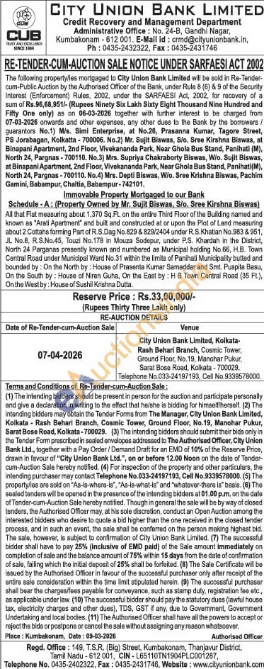 All that Flat measuring about 1,370 Sq.Ft. on the entire Third Floor of the Building named and known as "Arati Apartment and built and constructed at or upon the Plot of Land measuring about 2 Cottahs forming Part of R.S.Dag No.829 & 829/2404 under R.S.Khatian No.983 & 951, JL No.8, R.S.No.45, Touzi No.178 in Mouza Sodepur, under P.S. Khardah in the District, North 24 Parganas presently known and numbered as Municipal holding No.66, H.B. Town Central Road under Municipal Ward No.31 within the limits of Panihati Municipality butted and bounded by: On the North by: House of Prasenta Kumar Samaddar and Smt. Puspita Basu, On the South by: House of Niren Guha, On the East by: H B Town Central Road (35 Ft.), On the West by: House of Sushil Krishna Dutta.