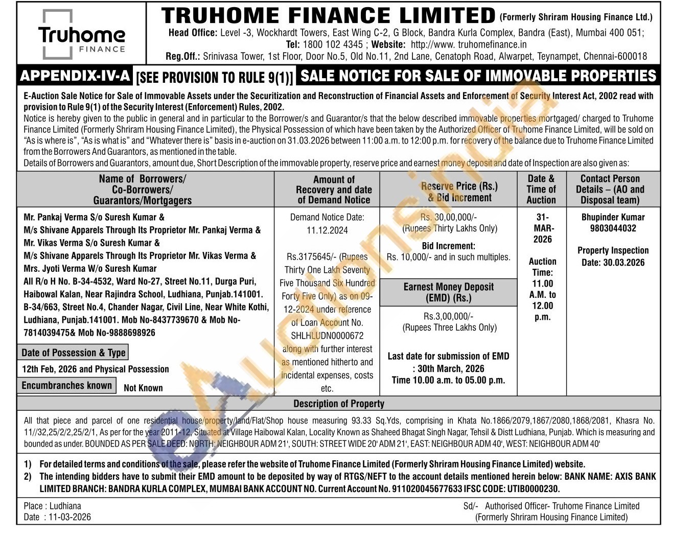 All that piece and parcel of one residential house/property/land/Flat/Shop house measuring 93.33 Sq. Yds, comprising in Khata No.1866/2079,1867/2080,1868/2081, Khasra No. 11//32,25/2/2,25/2/1, As per for the year 2011-12, Situated at Village Haibowal Kalan, Locality Known as Shaheed Bhagat Singh Nagar, Tehsil & Distt Ludhiana, Punjab. Which is measuring and bounded as under. BOUNDED AS PER SALE DEED: NORTH: NEIGHBOUR ADM 211, SOUTH: STREET WIDE 20' ADM 21', EAST: NEIGHBOUR ADM 40', WEST: NEIGHBOUR ADM 40