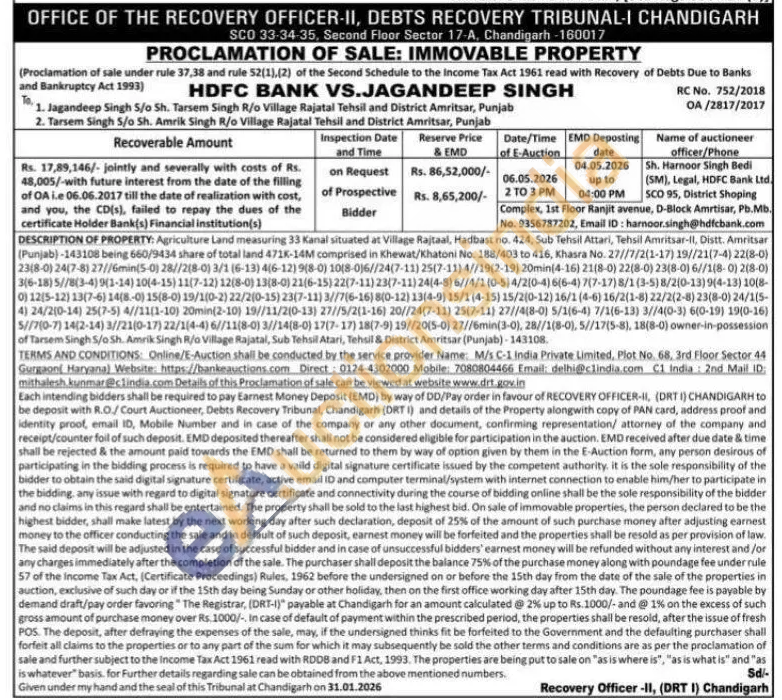 DESCRIPTION OF PROPERTY: Agriculture Land measuring 33 Kanal situated at Village Rajtaal, Hadbast no. 424, Sub Tehsil Attari, Tehsil Amritsar-Il, Distt. Amritsar (Punjab)-143108 being 660/9434 share of total land 471K-14M comprised in Khewat/Khatoni No. 188/403 to 416, Khasra No. 27//7/2(1-17) 19//21(7-4) 22(8-0) 2318-0)24(7-8)27//6min(5-0) 28//2(8-0) 3/1 (6-13) 4(6-12)9(8-0) 10(8-0)6//24(7-11) 25(7-11)4//19(2-19) 20min(4-16) 21(8-0) 22(8-0) 23(8-0)6//1(8-0) 2(8-0) 316-18)5//8(3-4)9(1-14) 10(4-15)11(7-12) 12(8-0)13(8-0)21(6-15)22(7-11)23(7-11)24(4-8) 6//4/1 (0-5) 4/2(0-4)6(6-4) 7(7-17)8/1(3-5)8/2(0-13)9(4-13) 10(8-0) 12(5-12) 13(7-6) 14(8.-0) 15(8-0) 19/1(0-2)22/2(0-15)23(7-11) 3//7(6-16)8(0-12) 13(4-9) 15/1 (4-15) 15/2(0-12) 16/1 (4-6) 16/2(1-8) 22/2(2-8) 23(8-0) 24/15-4) 24/2(0-14) 25(7-5) 4//11(1-10) 20min(2-10) 19//11/2(0-13) 27//5/2(1-16) 20//24(7-11) 25(7-11) 27//4(8-0) 5/1(6-4) 7/1(6-13) 3//4(0-3) 6(0-19) 19(0-16) 5//7(0-7) 14(2-14) 3//21(0-17) 22/1(4-4) 6//11(8-0) 3//14(8-0) 17(7-17) 18(7-9) 19//20(5-0) 27//6min(3-0), 28//1(8-0), 5//17(5-8), 18(8-0) owner-in-possession of Tarsem Singh 5/o Sh. Amrik Singh R/o Village Rajatal, Sub Tehsil Atari, Tehsil & District Amritsar (Punjab)-143108