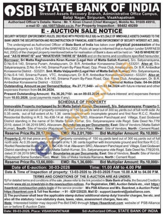Authorised Officer's Details: Name: Mr. Y. Kiran Chand (Chief Manager), Mobile No : 9160949910