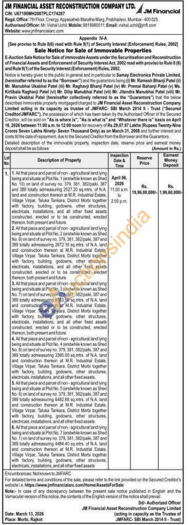 4. All that piece and parcel of non-agricultural land lying being and situate at Plot No. 4 (erstwhile known as Shed No. 8) on land of survey no. 379, 381, 382/paki, 387 and 389 totally admeasuring 3365.00 sq.mirs. of N.A. land and construction thereon at MR. Industrial Estate Village Virpar, Taluka Tankara, District Morbi together with factory, building, godowns, other structures, electricals, installations, and all other fixed assets.