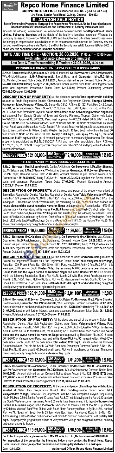 DESCRIPTION OF PROPERTY: All the piece and parcel of the property comprised at Salem East Registration District, Attur Sub-Registration District, Attur Taluk, Valayamadevi Village, Patta No.1029, present Patta No.1076, S.No. 145/1, Punj. Hec.2.59.0, Ac.6.40, Asst. Rs.3.97, in this leaving Ac. 0.40 cents on South Western side, the remaining Ac. 6.00 cents has been divided into house plots and the layout named as Kumaran Nagar and approved by Resolution No. 16/2013 of Valayamadevi Panchayat and in this House Plot No.89 measuring East West 40' on both sides, North South 30' on both sides, total extent 1200 square feet situate within the following boundaries: On the West of Plot No.90 purchased by Selvam, On the East of Plot No.88 purchased by Madhaiyan, On the South of 23' wide East West Panchayat Common Road in S.No. 145/1, On the North of Plot No.80, The above mentioned property has got all mamool and easementary rights