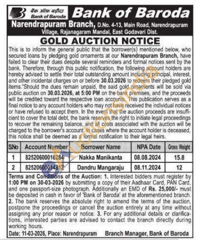 Bank of Baroda Gold Auctions Auction in East Godavari
