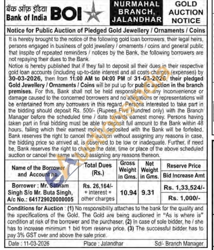 Bank of India Gold Auctions Auction in Jalandhar
