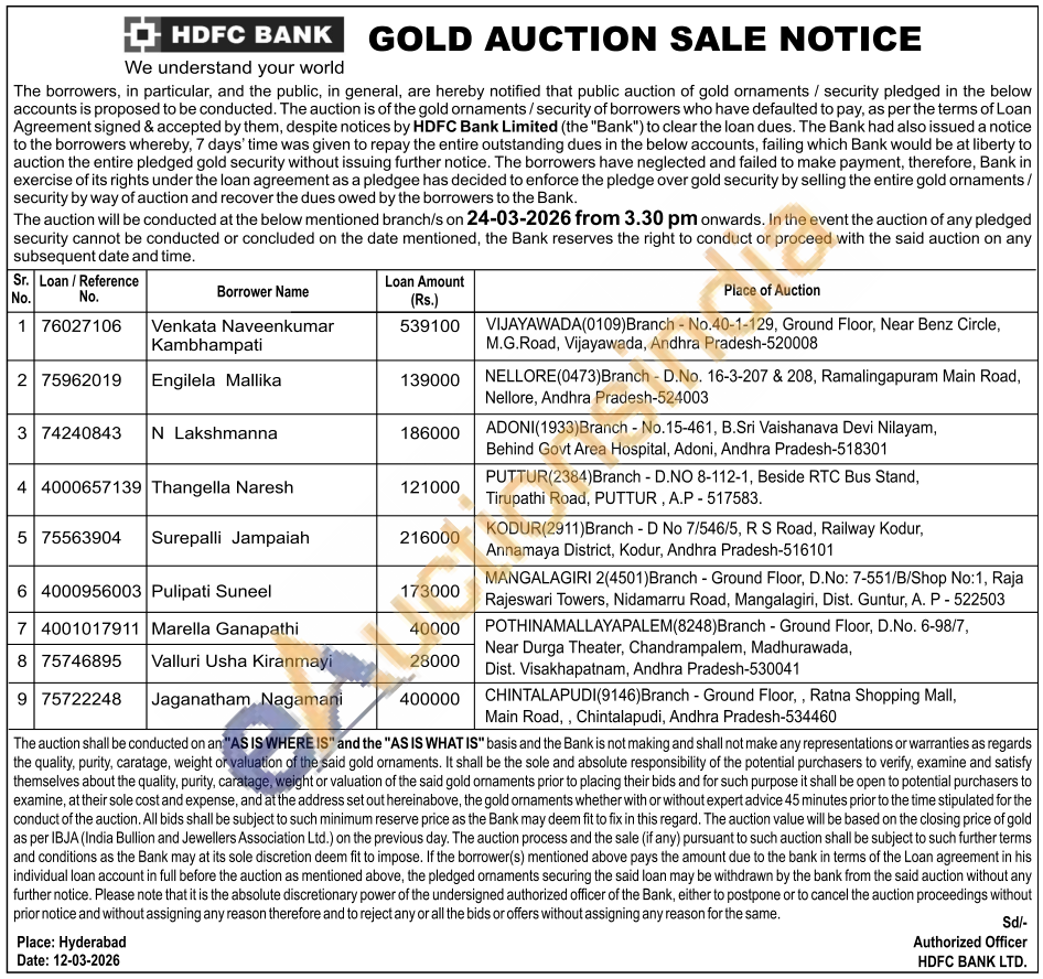 HDFC Bank Gold Auctions Auction in Hyderabad