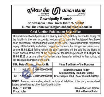Union Bank of India Gold Auctions Auction in Kolar
