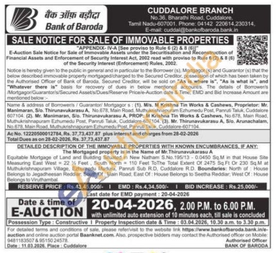 Contact no 04142 220614,230314, E-mail: cuddal@bankofbaroda.bank.in