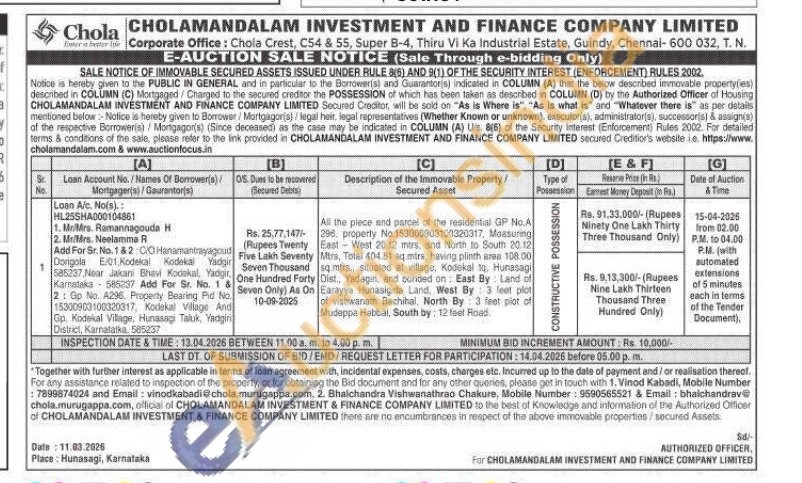 All the piece and parcel of the residential GP No.A 296. property No.153000903100320317, Maasuring East-West 20.12 mtrs, and North to South 20.12 Mtra, Total 404.81 sq mirs, having plinth area 108.00 sq mtrs, situated at village. Kodekal to. Hunasagi Dist., Yadagri and bonded on. East By: Land of Earayya Hunasigida Land, West By 3 leet plot of vishwanath Bachihal, North By 3 feet plot of Mudeppa Hebbal, South by: 12 feel Road