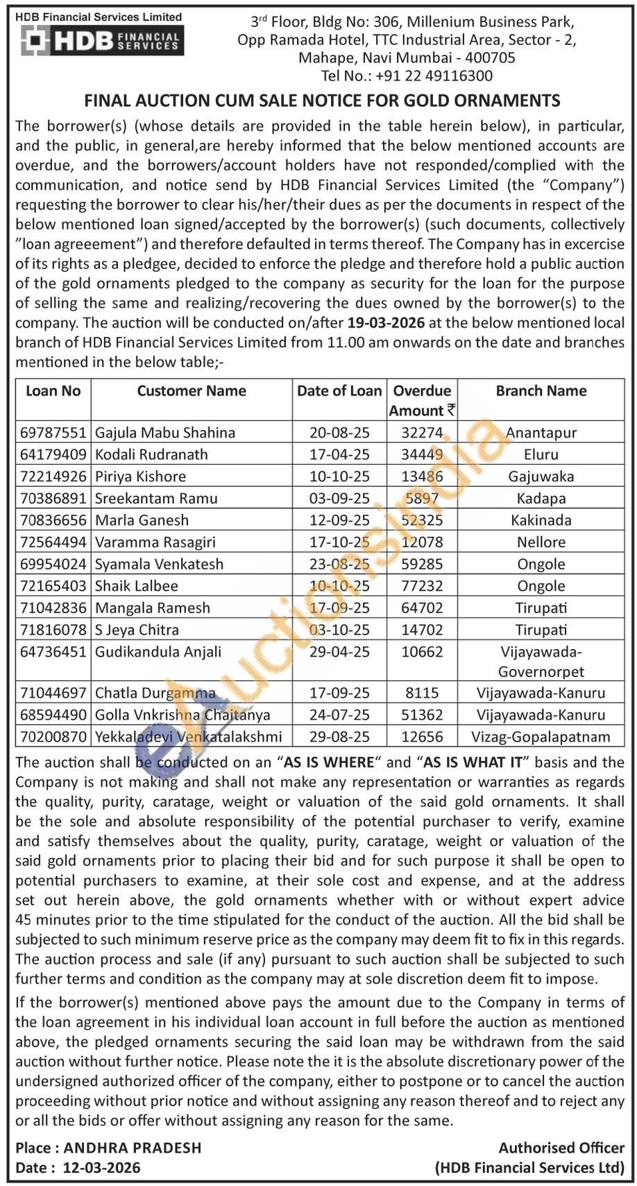 HDB Financial Services Limited Gold Auctions Auction in Anantapur