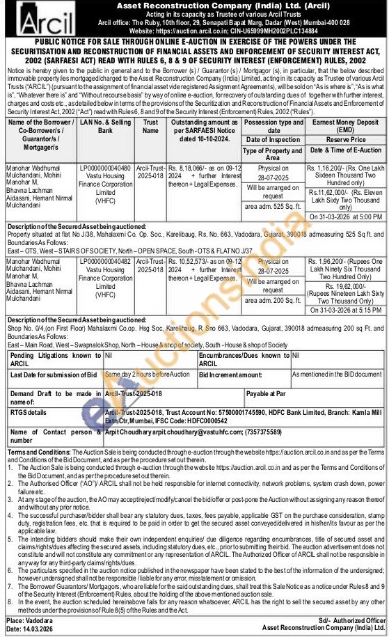 Description of the Secured Asset beingauctioned: Shop No. 0/4,(on First Floor) Mahalaxmi Co.op. Hsg Soc, Karelihaug, R Sno 663, Vadodara, Gujarat, 390018 admeasuring 200 sq Ft. and Boundaries As Follows: East-Main Road, West-Swapnalok Shop, North-House & shop of society, South-House & shop of Society