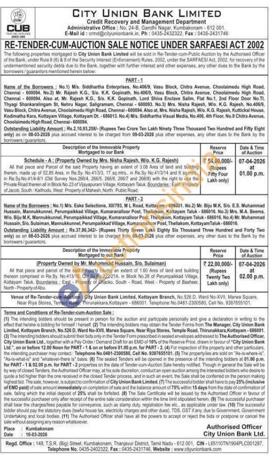 All that piece and parcel of the said Property having an extent of 160 Ares of land and building thereon comprised in Re Sy No 413/16 Old Sy: No.222/21A, in Block No. 25 of Perumpaikkad Village Kottayam Taluk. Boundaries East Property of Chacko, South Road, West Property of Basheer. North-Property of Abu