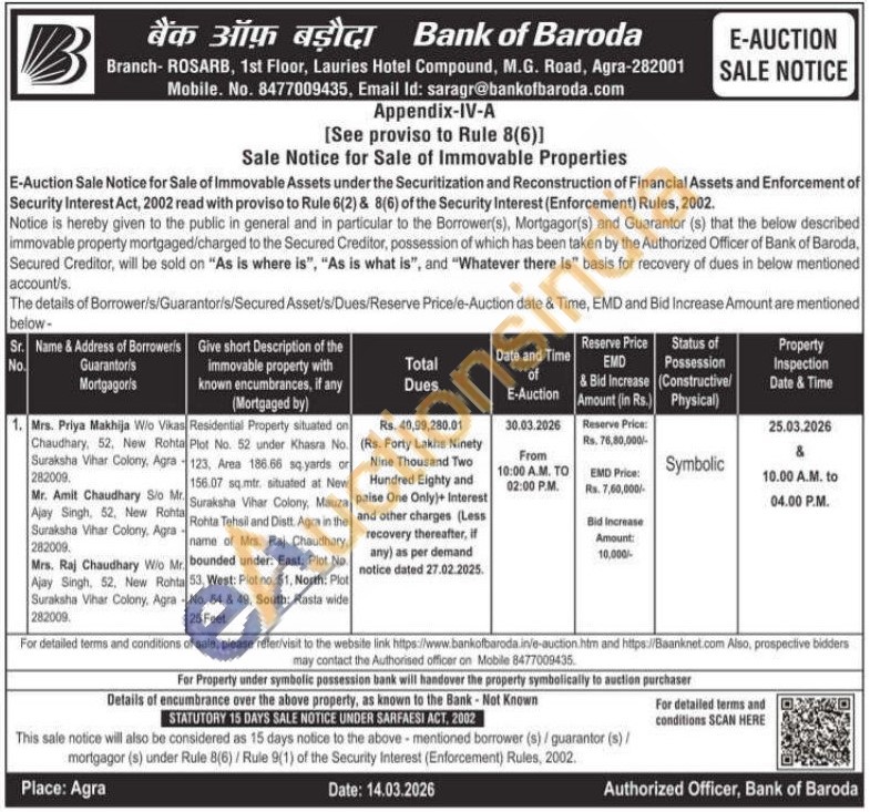 Residential Property situated on Plot No. 52 under Khasra No. 123, Area 186.66 sq yards or 156.07 sq.mtr. situated at New Suraksha Vihar Colony, Mauza Rohta Tehsil and Distt. Agra in the name of Mrs. Raj Chaudhary, bounded under: East: Plot No. 53. West: Plot no. 51, North: Plot No. 54 & 49, South: Rasta wide 25 Feet