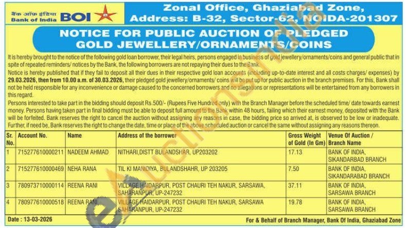Bank of India Gold Auctions Auction in Bulandshahr