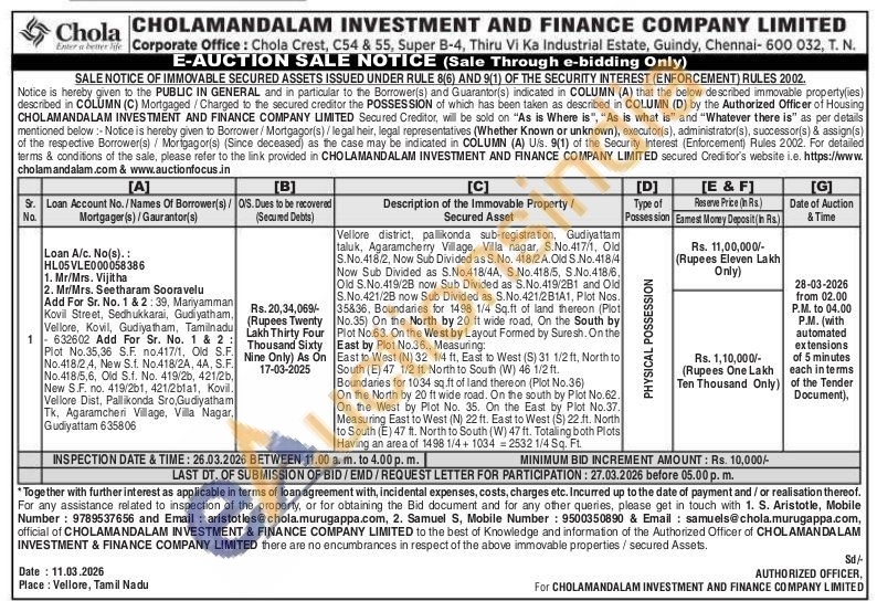Vellore district, pallikonda sub-registration, Gudiyattam taluk, Agaramcherry Village, Villa nagar, S.No.417/1, Old S.No.418/2, Now Sub Divided as S.No. 418/2A.Old S.No.418/4 Now Sub Divided as S.No.418/4A, S.No.418/5, S.No.418/6 Old S.No.419/28 now Sub Divided as S.No.419/281 and Old S.No.421/2B now Sub Divided as S.No.421/2B1A1, Plot Nos. 35836, Boundaries for 1498 1/4 Sq.ft of land thereon (Plot No.35) On the North by 20 ft wide road, On the South by Plot No.63. On the West by Layout Formed by Suresh. On the East by Plot No.36., Measuring: East to West (N) 32 1/4 ft, East to West (S) 31 1/2 ft, North to South (E) 47 1/2 ft. North to South (W) 46 1/2 ft. Boundaries for 1034 sq.ft of land thereon (Plot No.36) On the North by 20 ft wide road. On the south by Plot No.62. On the West by Plot No. 35. On the East by Plot No.37. Measuring East to West (N) 22 ft. East to West (S) 22.ft. North to South (E) 47 ft. North to South (W) 47 ft. Totaling both Plots Having an area of 1498 1/4+10342532 1/4 Sq. Ft