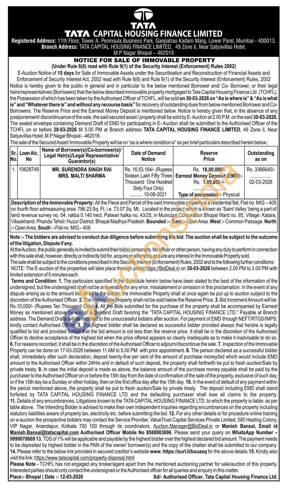 Description of the Immovable Property: All the Piece and Parcel of the said Immovable property is a residential flat, Flat no. MIG-405 on fourth floor admeasuring area: 786.23 Sq. Ft. i.e. 73.07 Sq. Mt. Located in the project which is known as 'Saint Valley' being a part of land revenue survey no. 04, rakba 0.140 hect. Patwari halka no. 43/25, in Municipal Corporation Bhopal Ward no. 85, Village: Katara, Vikaskhand: Phanda Tehsil: Huzur District: Bhopal Madhya Pradesh. Bounded:- East: Open Area. West:-Common Passage. North -Open Area South: -Flat no. MIG-406