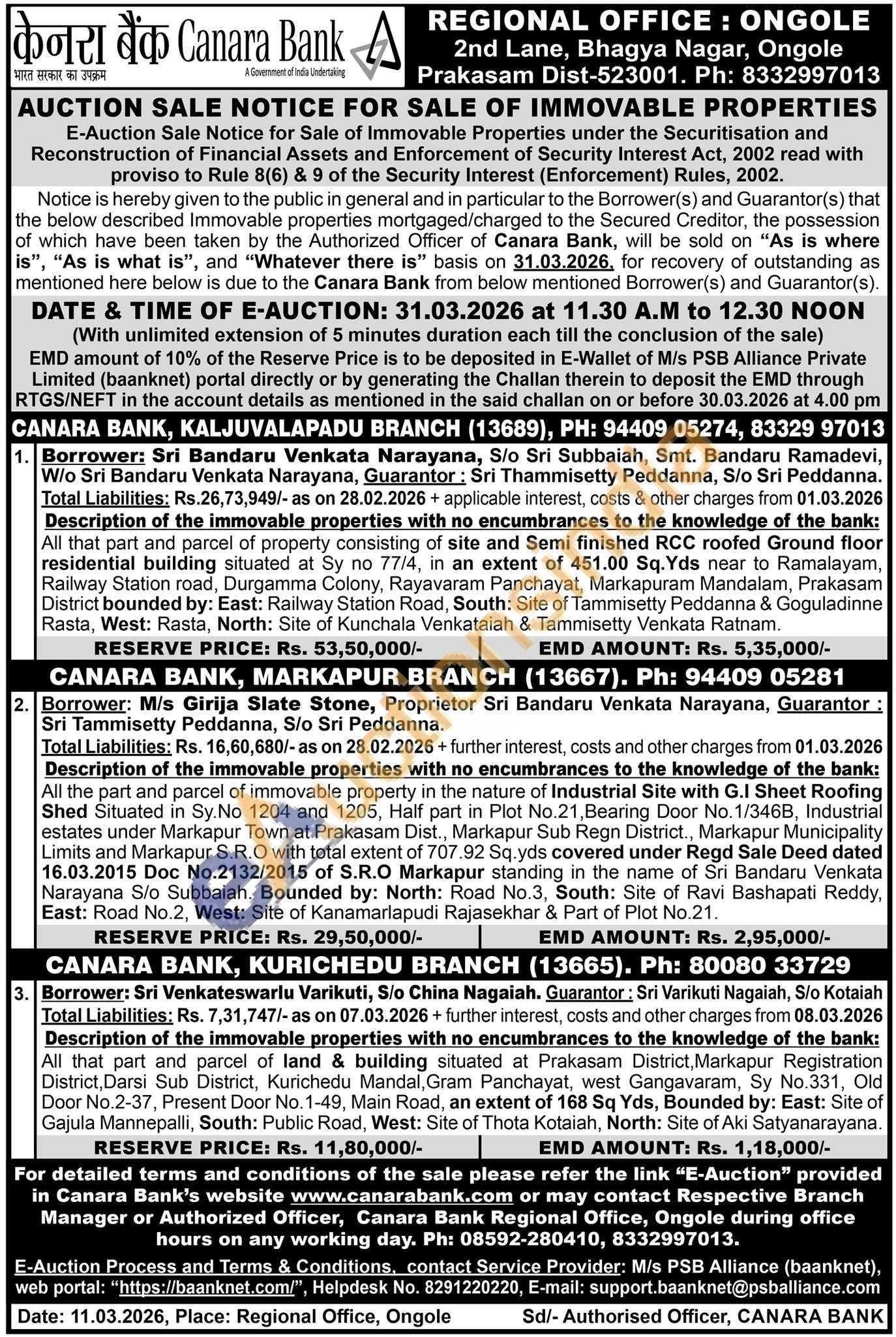 Description of the immovable properties with no encumbrances to the knowledge of the bank: All that part and parcel of land & building situated at Prakasam District, Markapur Registration District, Darsi Sub District, Kurichedu Mandal, Gram Panchayat, west Gangavaram, Sy No.331, Old Door No.2-37, Present Door No. 1-49, Main Road, an extent of 168 Sq Yds, Bounded by: East: Site of Gajula Mannepalli, South: Public Road, West: Site of Thota Kotaiah, North: Site of Aki Satyanarayana