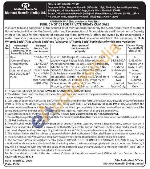 Flat No. 405 Parijat Vrundavan Sr No. 75/9 Jadhav Nagar Raykar Mala Dhayaridhayari Pune Maharashtra-411041. More Particularly Mentioned In The Sale Deed Registered No. 586-2018 Dated-18-Jan-18 In The Office of Sub Registrar Haveli No. 9 Pune. Having Boundaries-North-75 Hissa No. 9/14 of 30 Ft Road, South- 20 Ft Road, East-Property of Shivaji Anant Kawale and Other, West-Property of Annasaheb Mitkari and Other