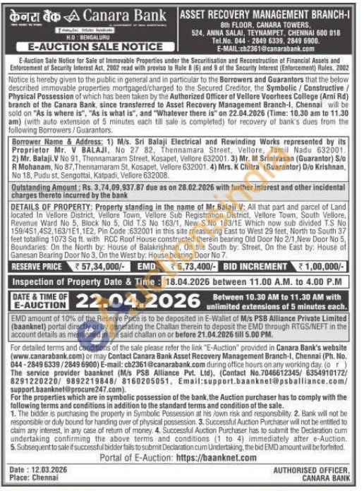 DETAILS OF PROPERTY: Property standing in the name of Mr Balaji V: All that part and parcel of Land located In Vellore District, Vellore Town, Vellore Sub Registration District, Vellore Town, South Vellore, Revenue Ward No 5, Block No. 5, Old T.S No 163/1, New S.No 163/1E Which now sub divided T.S. No 159/451,452,163/1E1, 1E2, Pin Code 632001 in this site measuring East to West 29 feet, North to South 37 feet totalling 1073 Sq ft. with RCC Roof House constructed therein bearing Old Door No 2/1, New Door No 5, Boundaries. On the North by: House of Balakrishnan, On the South by: Street, On the East by: House of Ganesan Bearing Door No 3. On the West by: House bearing Door No 7