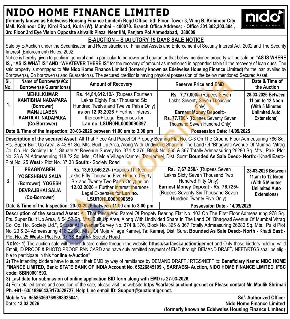 Description of the secured Asset: All That Piece And Parcel Of Propety Bearing Flat No. 103 On The First Floor Admeasuring 978 Sq. Fts. Super Built Up Area, & 54.52 Sq. Mts. Built Up Area, Along With Undivided Share In The Land Of "Bhagwati Avenue Of Mumbai Vitrag Co. Op. Ho. Society Ltd.", Situate At Revenue Survey No. 374 & 376, Block No. 365 & 367 Totally Admeasuring 26280 Sq. Mts., Paiki Plot No. 23 & 24 Admeasuring 418.22 Sq. Mts., Of Moje Village Kamrej, Ta: Kamrej, Dist: Surat Bounded As Sale Deed:- North:- Khadi East:-Plot No. 25 West:- Plot No. 37 38 South:- Society Road