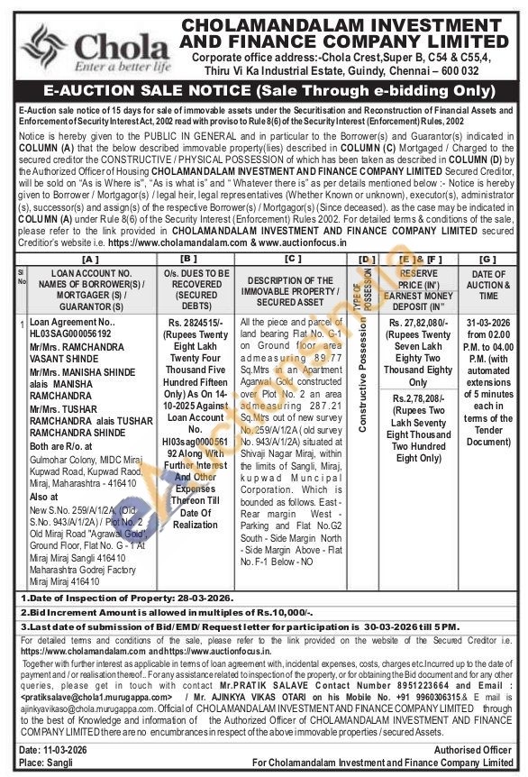All the piece and parcel of land bearing Flat No. G-1 on Ground floor area. admeasuring 89.77 Sq.Mtrs in an Apartment Agarwal Gold constructed over Plot No. 2 an area admeasuring 287.21 Sq.Mtrs out of new survey No. 259/A/1/2A (old survey No. 943/A/1/2A) situated at Shivaji Nagar Miraj, within the limits of Sangli, Miraj, kupwad Muncipal Corporation. Which is bounded as follows. East-Rear margin West. Parking and Flat No.G2 South Side Margin North -Side Margin Above - Flat No. F-1 Below-NO
