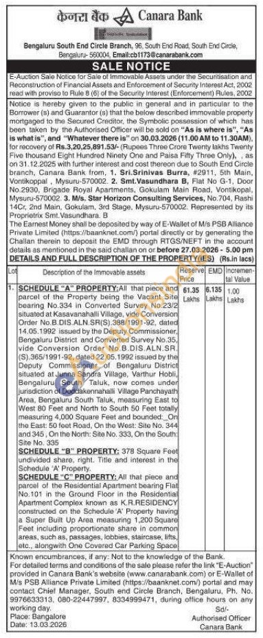 SCHEDULE "A" PROPERTY: All that piece and parcel of the Property being the Vacant Site bearing No.334 in Converted Survey No.23/2 situated at Kasavanahalli Village, vide Conversion Order No.B.DIS.ALN.SR(S).388/1991-92, dated 14.05.1992 issued by the Deputy Commissioner, Bengaluru District and Converted Survey No.35. vide Conversion Order No.B.DIS.ALN.SR. (S).365/1991-92, dated 22.05.1992 issued by the Deputy Commissioner of Bengaluru District situated at Junna Sandra Village, Varthur Hobli, Bengaluru South Taluk, now comes under jurisdiction of Doddakennahalli Village Panchayath Area, Bengaluru South Taluk, measuring East to West 80 Feet and North to South 50 Feet totally measuring 4,000 Square Feet and bounded On the East: 50 feet Road, On the West: Site No. 344 and 345, On the North: Site No. 333, On the South: Site No. 335