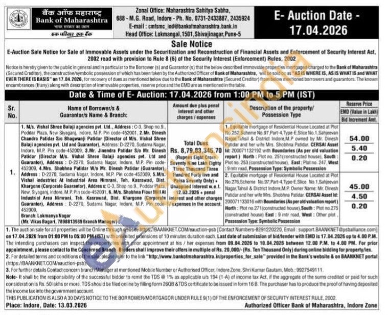 2. Equitable mortgage of Residential House Located at Plot No 276.Scheme No.97.Part-4, Type-Silice No.1 Sangeevan Nagar, Tahsil & District Indore M.P. Owner Name: Mr. Dinesh Patidar and her wife Mrs. Shobhna Patidar CERSAI Asset id: 200071133016 with Boundaries (As per old valuation report) Nerth: Plot no 271 (constructed house) South Plotno 275 (constructed house) East: mtr road, West: Other plot Possession Type: Symbolic Possession