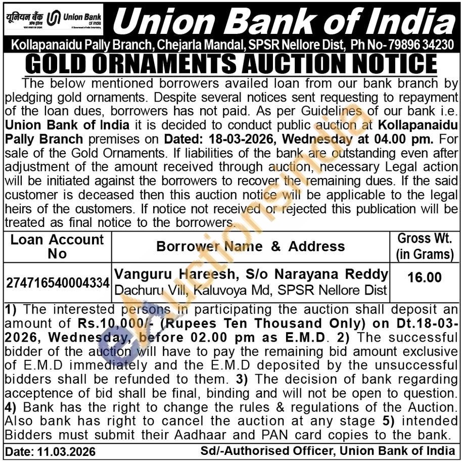 Union Bank of India Gold Auctions Auction in Nellore