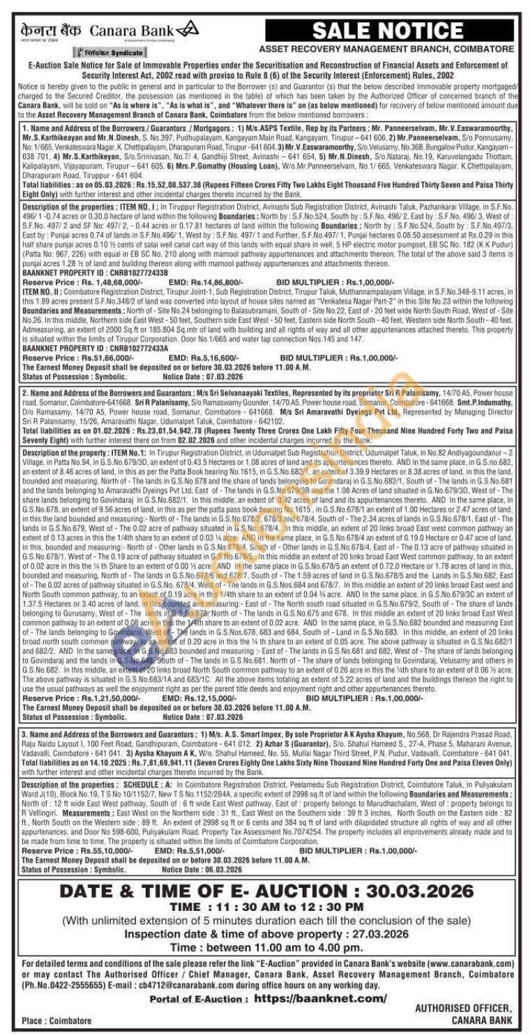 ITEM NO. II: Coimbatore Registration District, Tirupur Joint-1, Sub Registration District, Tirupur Taluk, Muthannampalayam Village, in S.F.No.348-9.11 acres, in this 1.89 acres present S.F.No.348/2 of land was converted into layout of house sites named as "Venkatesa Nagar Part-2" in this Site No.23 within the following Boundaries and Measurements: North of Site No.24 belonging to Balasubramani, South of Site No.22, East of 20 feet wide North South Road, West of - Site No.26. In this middle, Northern side East West-50 feet, Southern side East West-50 feet, Eastern side North South-40 feet, Western side North South-40 feet. Admeasuring, an extent of 2000 Sq.ft or 185.804 Sq.mtr of land with building and all rights of way and all other appurtenances attached thereto. This property is situated within the limits of Tirupur Corporation. Door No. 1/665 and water tap connection Nos. 145 and 147. BAANKNET PROPERTY ID: CNRB102772433A