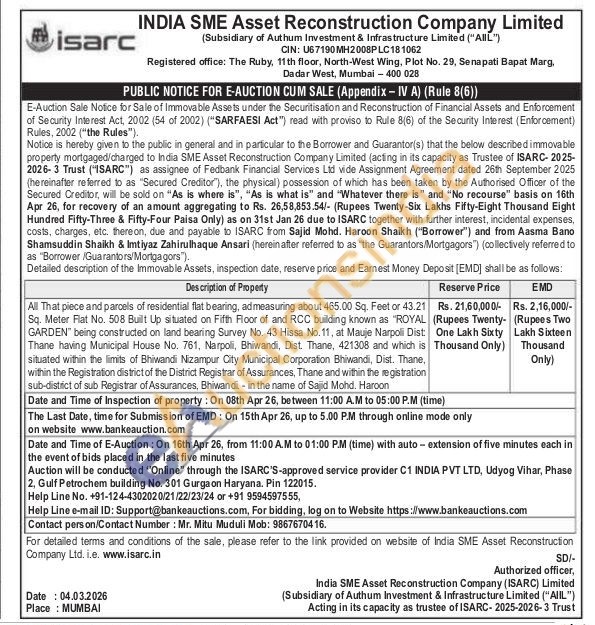 All That piece and parcels of residential flat bearing, ad measuring about 465.00 Sq. Feet or 43.21 Sq. Meter Flat No. 508 Built Up situated on Fifth Floor of and RCC building known as "ROYAL GARDEN" being constructed on land bearing Survey No. 43 Hissa No. 11, at Mauje Narpoll Dist: Thane having Municipal House No. 761, Narpoli, Bhiwandi, Dist. Thane, 421308 and which is situated within the limits of Bhiwandi Nizampur City Municipal Corporation Bhiwandi, Dist. Thane, within the Registration district of the District Registrar of Assurances, Thane and within the registration sub-district of sub Registrar of Assurances, Bhiwandi in the name of Sajid Mohd. Haroon