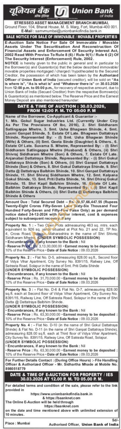Property No. 2: Flat No. D-5, admeasuring 828.00 sq.ft., Second floor of Vidya Vihar Apartment, City Survey No. 8391/15, Railway Line, Off Satrasta Road, Solapur in the name of Smt. Priti Datta Shinde