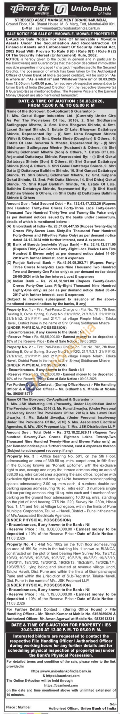 Property No. 3 -Office bearing No. 501, on the 5th Floor, admeasuring an area of 369.58 sq. mtrs. carpet area, in fifth floor in the building known as "Konark Epitome", with the exclusive right to use, occupy and enjoy the terrace admeasuring an area of 338.30 sq. mtrs carpet area adjoining the said office, together with exclusive right to use and occupy 14 No. basement scooter parking spaces admeasuring 2.00 sq. mtrs each, 4 numbers double car parking spaces admeasuring 16 sq. mtrs each, 3 numbers single stilt car parking admeasuring 10 sq. mtrs each and 1 number of car parking on the ground floor admeasuring 10.00 sq. mtrs, standing on the plot of land bearing CTS No. 220, Survey No. 230A, Hissa Nos. 1, 1/1 and 1/6, at Village Lohegaon, within the limits of Pune Municipal Corporation, Taluka-Havelli, District-Pune in the name of M's Associated Electricals Agencies
