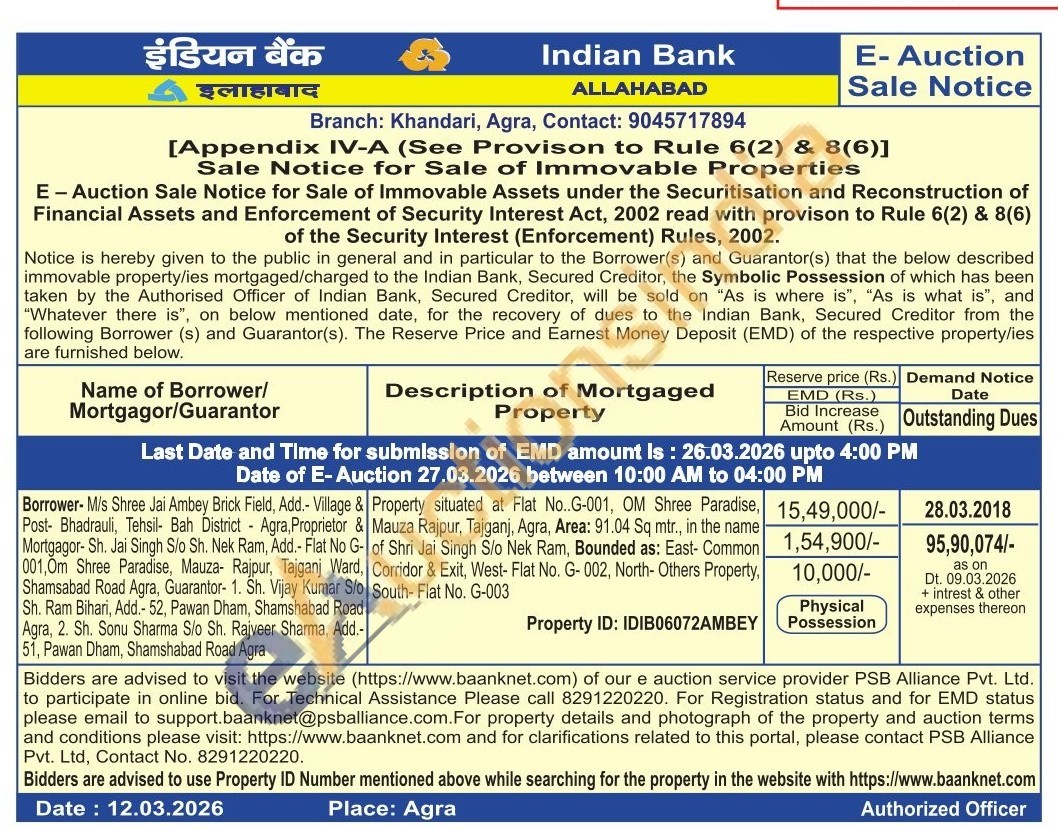 Property situated at Flat No..G-001, OM Shree Paradise, Mauza Rajpur, Tajganj, Agra, Area: 91.04 Sq mtr., in the name of Shri Jai Singh S/o Nek Ram, Bounded as: East- Common Corridor & Exit, West- Flat No. G-002, North- Others Property, South-Flat No. G-003