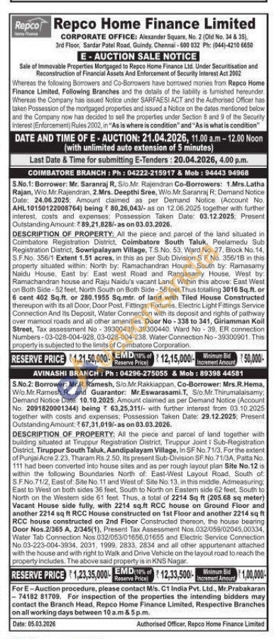 DESCRIPTION OF PROPERTY: All the piece and parcel of the land situated in Coimbatore Registration District, Coimbatore South Taluk, Peelamedu Sub Registration District, Sowripalayam Village, T.S.No. 53, Ward No. 27. Block No. 14, S.F.No. 356/1 Extent 1.51 acres, in this as per Sub Division SF No. 356/18 in this property situated within, North by: Ramachandran House, South by. Ramasamy Naidu House, East by: East west Road and Rangasamy House. West by: Ramachandran house and Raju Naidu's vacant Land. Within this above: East West on Both Side-52 feet, North South on Both Side-58 feet Thus totalling 3016 Sq.ft. or 6 cent 402 Sq.ft. or 280.1955 Sq.mtr. of land with Tiled House Constructed thereupon with its all Door, Door Post, Fittings, Fixtures, Electric Light Fittings Service Connection And Its Deposit, Water Connection with its deposit and rights of pathway over mamool roads and all other amenities. Door No-338 to 341, Giriamman Koil Street, Tax assessment No-39300439, 39300440. Ward No-39. ER connection Numbers-03-028-004-928,03-028-004-238. Water Connection No-39300901. This property is subjected to the limits of Coimbatore Corporation. RESERVE PRICE 1,21,50,000/- 특성은 12,15,000