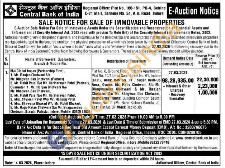 Flat No. 6, Ground Floor, "Krishna Apartment Plot No. 10/1 Usha Ganj, Street No. 01, Indore (M.P.), Area: 849 Sq. Ft., Super Built-Up Area, Owner: Mr. Rajiv Chetwani S/o Mr.Bhagwandas Chetwani & Mr. Ranjan Chetwani S/o Mr. Bhagwan Das Chetwani, Boundaries: North: Building Corridor, South: House No. 11 (Mr. Nand Kishore Badrilal Ji), East: Flat No. 07, West: Flat No. 05