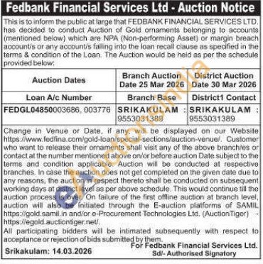 Fedbank Financial Services Ltd Gold Auctions Auction in Srikakulam