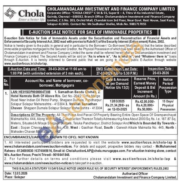 Descriptions Of The Property: All That Piece And Parcel Of Property Bearing Entire Open Space Of Grampanchayat Malmatta No. 444, Along With R.C.C. Construction Thereon Totally Admeasuring Area About 2000 Sq.fts. l.e. 187.87 Sq. Meters, Situated At Mouje Shegaon Dumala, Taluka Pandharpur, District Solapur And Which Is Bounded By Towards -East: Sopan Chavan Maimatta No. 439, West: Gaothan Road, South Ganesh Atkale Malmatta No. 445, North: Mahadev Chavan Malmatta No. 443