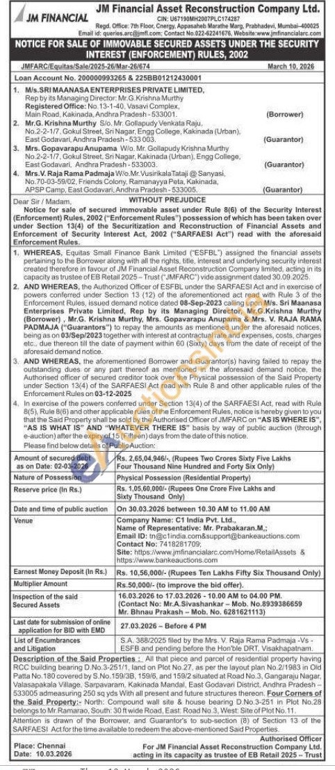 Description of the Said Properties: All that piece and parcel of residential property having RCC building bearing D.No.3-251/1, land on Plot No 27, as per the layout plan No.2/1983 in Old Patta No. 180 covered by S.No. 159/38, 159/5, and 159/2 situated at Road No.3, Gangaraju Nagar, Valasapakala Village. Sarpavaram, Kakinada Mandal, East Godavari District. Andhra Pradesh-533005 admeasuring 250 sq yds With all present and future structures thereon. Four Corners of the Said Property: North: Compound wall site & house bearing D.No 3-251 in Plot No.28 belongs to Mr. Ramarao, South: 30 ft wide Road, East Road No. 3, West Site of Plot No. 11.