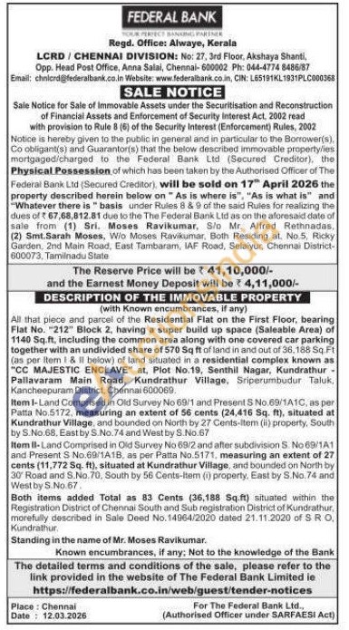 DESCRIPTION OF THE IMMOVABLE PROPERTY (with Known encumbrances, if any) : All that piece and parcel of the Residential Flat on the First Floor, bearing Flat No. "212" Block 2, having a super build up space (Saleable Area) of 1140 Sq.ft, including the common area along with one covered car parking together with an undivided share of 570 Sq ft of land in and out of 36.188 Sq.Ft (as per Item & Il below) of land situated in a residential complex known as "CC MAJESTIC ENCLAVE" at, Plot No.19, Senthil Nagar, Kundrathur-Pallavaram Main Road, Kundrathur Village, Sriperumbudur Taluk, Kancheepuram District, Chennai 600069.