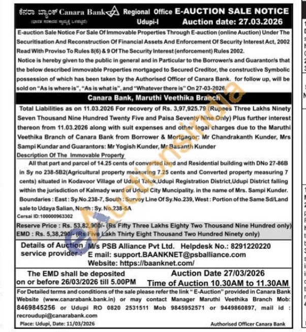All that part and parcel of 14.25 cents of converted land and Residential building with DNo 27-86B in Sy no 238-582(Agricultural property measuring 7.25 cents and Converted property measuring 7 cents) situated in Kodavoor Village of Udupi Taluk, Udupi Registration District, Udupi District falling within the jurisdiction of Kalmady ward of Udupi City Muncipality. in the name of Mrs. Sampi Kunder. Boundaries: East: Sy.No.238-7, South: Survey Line Of Sy.No.239, West: Portion of the Same Sd/Land sale to Udaya Salian, North: Sy. No.238-5A