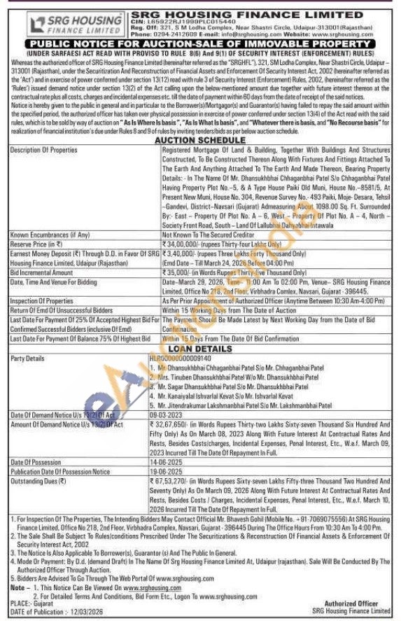Registered Mortgage Of Land & Building. Together With Buildings And Structures Constructed, To Be Constructed Thereon Along With Fixtures And Fittings Attached To The Earth And Anything Attached To The Earth And Made Thereon, Bearing Property Details: In The Name Of Mr. Dhansukhbhai Chhaganbhai Patel S/o Chhaganbhai Patel Having Property Plot No.-5. & A Type House Paiki Old Muni, House No.-8581/5, At Present New Muni, House No. 304, Revenue Survey No. 453 Paiki, Moje Desara, Tehsil -Gandevi, District-Navsari (Gujarat) Admeasuring About 1098.00 Sq. Ft. Surrounded By: East Property Of Plot No. A-6, West-Property Of Plot No. A-4, North-Society Front Road, South-Land Of Lallubhai Dahyabhai Intawala