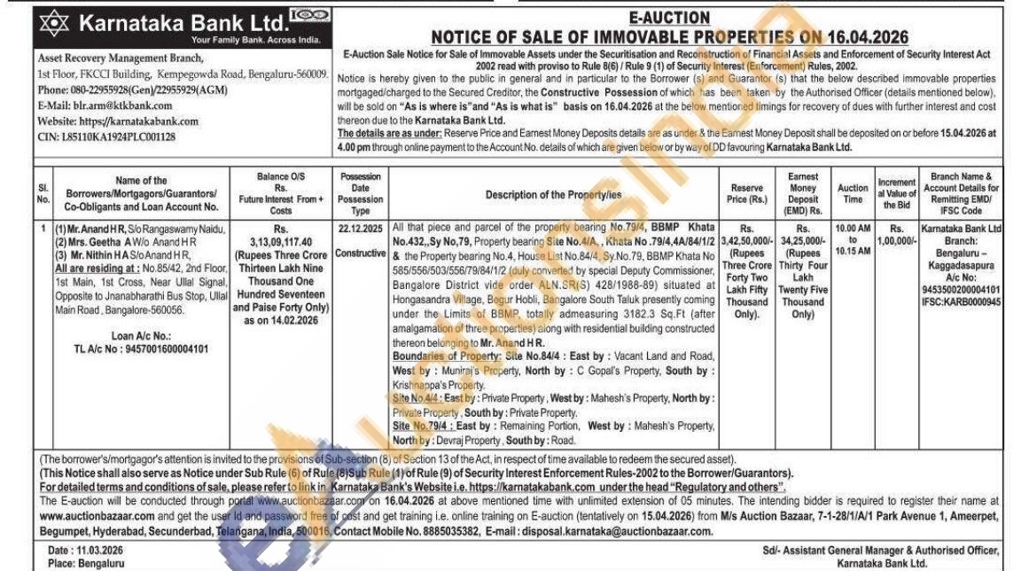 & the Property bearing No.4, House List No. 84/4, Sy. No. 79, BBMP Khata No 585/556/503/556/79/84/1/2 (duly converted by special Deputy Commissioner, Bangalore District vide order ALN.SR(S) 428/1988-89) situated at Hongasandra Village, Begur Hobli, Bangalore South Taluk presently coming under the Limits of BBMP, totally admeasuring 3182.3 Sq.Ft (after amalgamation of three properties) along with residential building constructed thereon belonging to Mr. Anand HR.