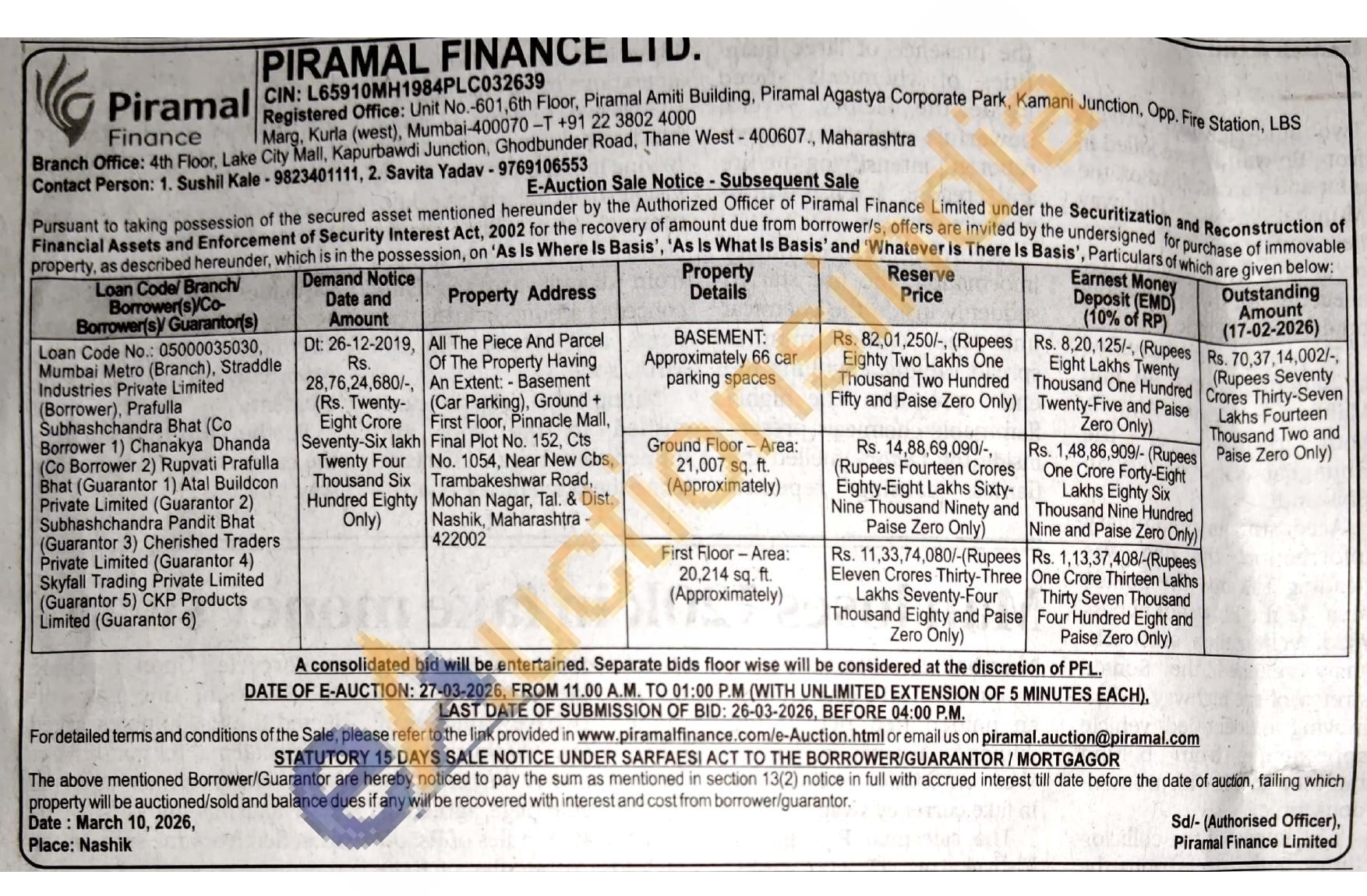 All The Piece And Parcel Of The Property Having An Extent: Basement (Car Parking), Ground + First Floor, Pinnacle Mall, Final Plot No. 152, Cts No. 1054, Near New Cbs, Trambakeshwar Road, Mohan Nagar, Tal. & Dist. Nashik, Maharashtra -422002 BASEMENT: Approximately 66 car parking spaces