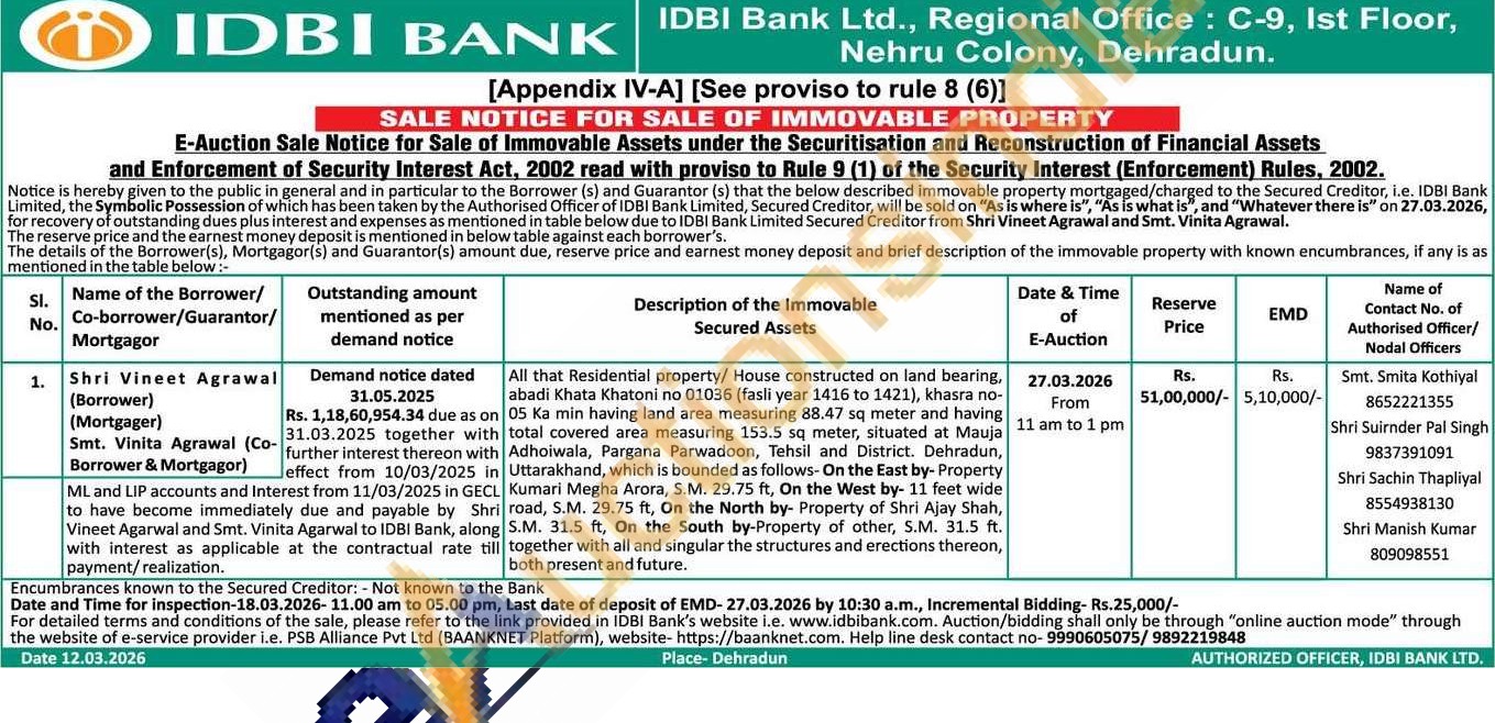 All that Residential property/ House constructed on land bearing, abadi Khata Khatoni no 01036 (fasli year 1416 to 1421), khasra no-05 Ka min having land area measuring 88.47 sq meter and having total covered area measuring 153.5 sq meter, situated at Mauja Adhoiwala, Pargana Parwadoon, Tehsil and District. Dehradun, Uttarakhand, which is bounded as follows-On the East by- Property Kumari Megha Arora, S.M. 29.75 ft, On the West by-11 feet wide road, S.M. 29.75 ft, On the North by- Property of Shri Ajay Shah, S.M. 31.5 ft, On the South by-Property of other, S.M. 31.5 ft. together with all and singular the structures and erections thereon, both present and future.