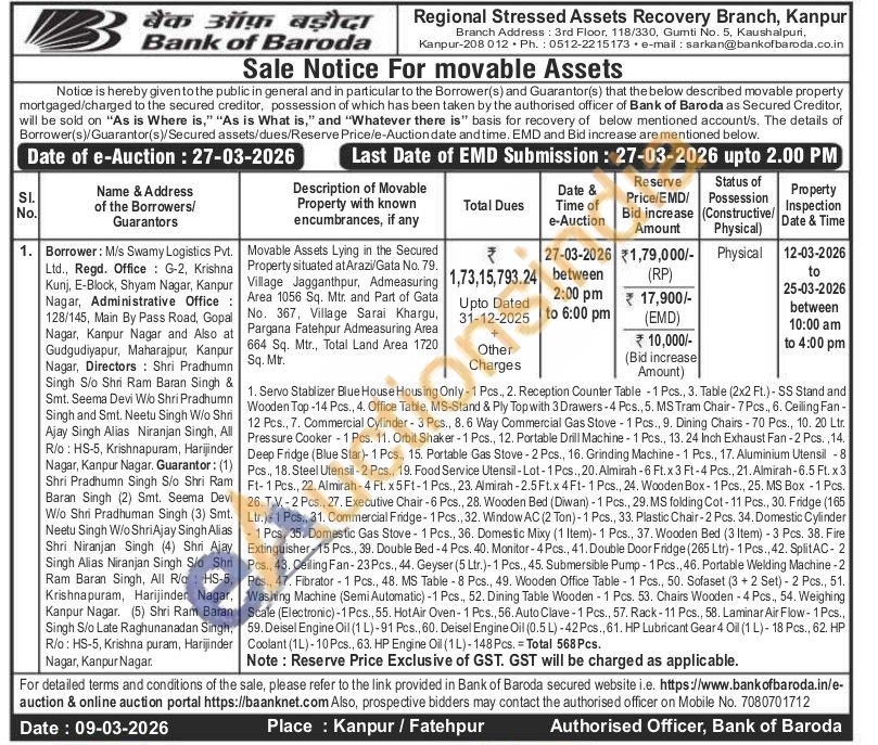 Movable Assets Lying in the Secured Property situated at Arazi/Gata No. 79. Village Jagganthpur, Admeasuring Area 1056 Sq. Mtr. and Part of Gata No. 367, Village Sarai Khargu, Pargana Fatehpur Admeasuring Area 664 Sq. Mtr., Total Land Area 1720 Sq. Mtr.