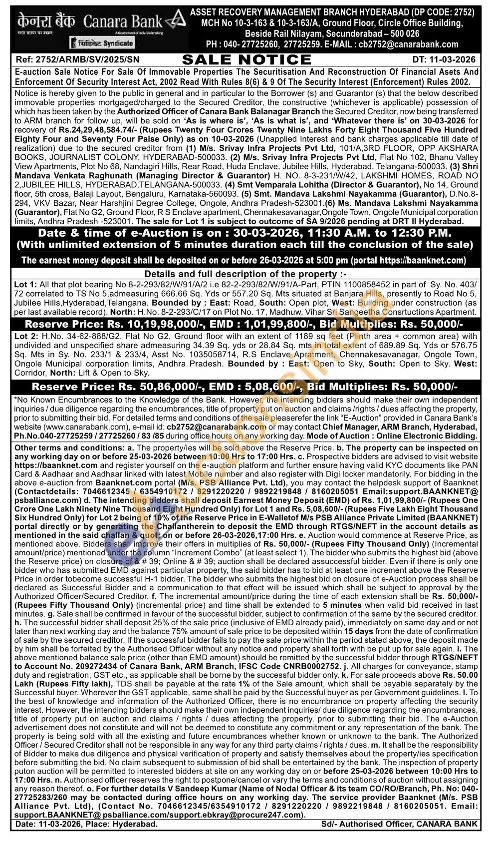 Contact Chief Manager, ARM Branch, Hyderabad, Ph.No.040-27725259/27725260/83/85