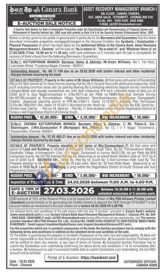 DETAILS OF PROPERTY: Property standing in the name of Mrs.Gunasundaraj P: All that piece and parcel of Land and Building is situated at Thiruvallur District, Avadi Taluk, No.20, Thirunindravur Madura Karakollai Village, Krishnapuram (Via) IVY Nagar, Comprised in Survey No257/28, As per Patta No.929 comprised Survey No. 257/56 bearing Plot No. 19, Measuring to an extent North Western Side of 1575 Sq.ft out of 3240 Sq.ft. BOUNDED ON: North By: Plot No.18, South By: 5 Feet Common Path, East By: The Property belongs to Mr. K Kuppan (Plot No.19 East side), West By: 20 Feet Wide Road. Measuring to an extent of 1575 Sq.ft. Land with Building is lying within the Registration District of South Chennai and Sub Registration District of Avadi.