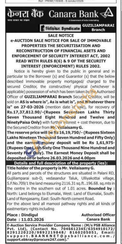 All parts and parcels of the structures are situated in Palani RD, Gujiliamparai sub-D, vedasandur Taluk, Ulliyakottai village, S.F.No.709/1 the land measuring 2116.31 sq.ft..196.68. sq.mts in the centre in the southern out of 1.01 acres. Bounded by: North: Land belongs to Elumalai, West: Land of Elumalai, South: Land of Rengasamy, East: South-North cement Road